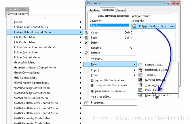 本文详细介绍如何在ArcGIS中使用PolygonFeatureClassFromLines工具从线要素创建面要素的步骤。首先启动ArcCatalog,进入自定义模式,启用上下文菜单,并通过命令选项找到并使用PolygonFeatureClassFromLines功能。