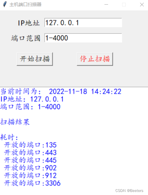 self.porttext.insert(END, "当前时间为: "+self.get_current_time()+"\nIP地址:"+self.ip+"\n端口范围:"+self.port_content.get()+"\n\n扫描结果\n\n")