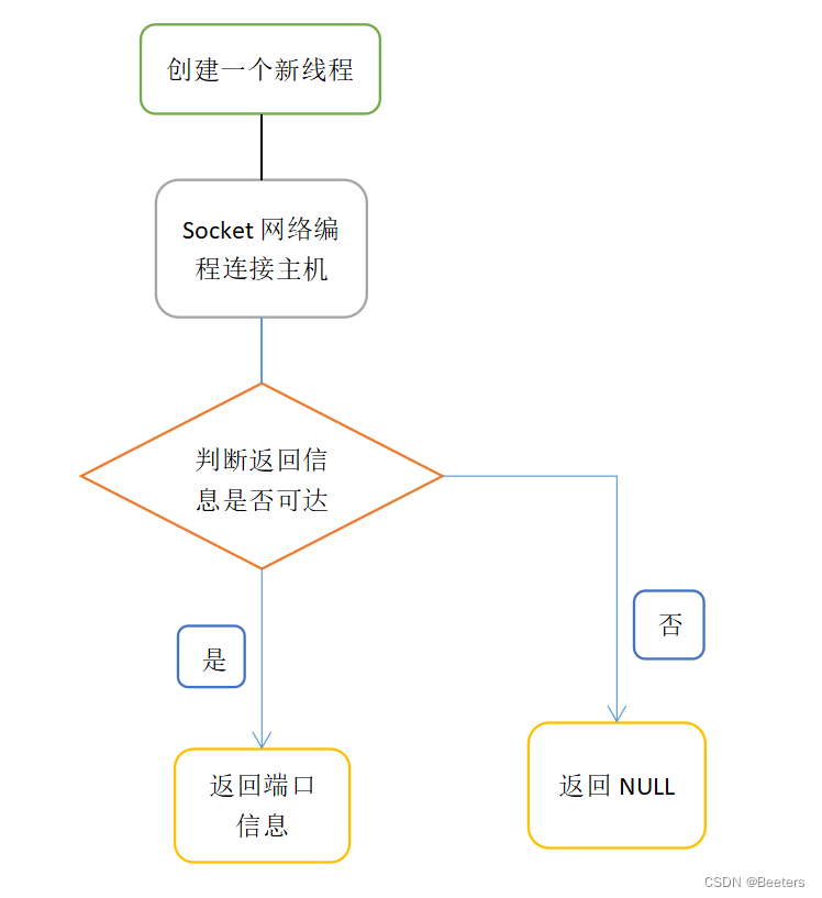 创建一个新线程,用socket网络编程连接目标主机,判断服务器端口是否打开,如果服务端口打开,输出端口号,否则不输出,因为它端口未开放,打印出来没有意义。