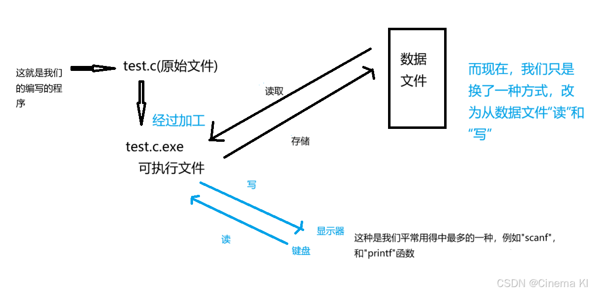 一般来说,文件分为程序文件和数据文件。顾名思义,程序文件就是我们存放我们代码的文件,数据文件就是存放数据的文件,下面有一个图,可以帮助大家更好的了解一下
