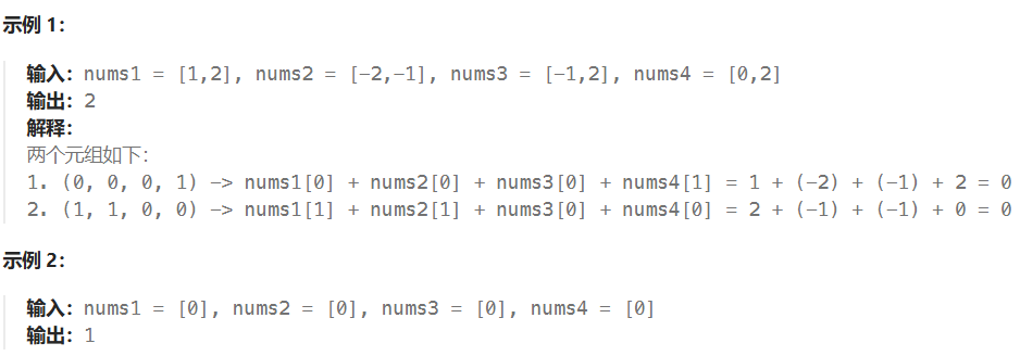 给你四个整数数组 nums1、nums2、nums3 和 nums4 ,数组长度都是 n ,请你计算有多少个元组 (i, j, k, l) 能满足: