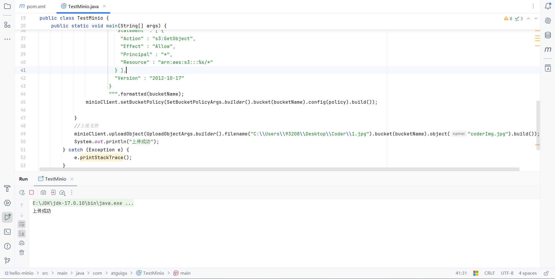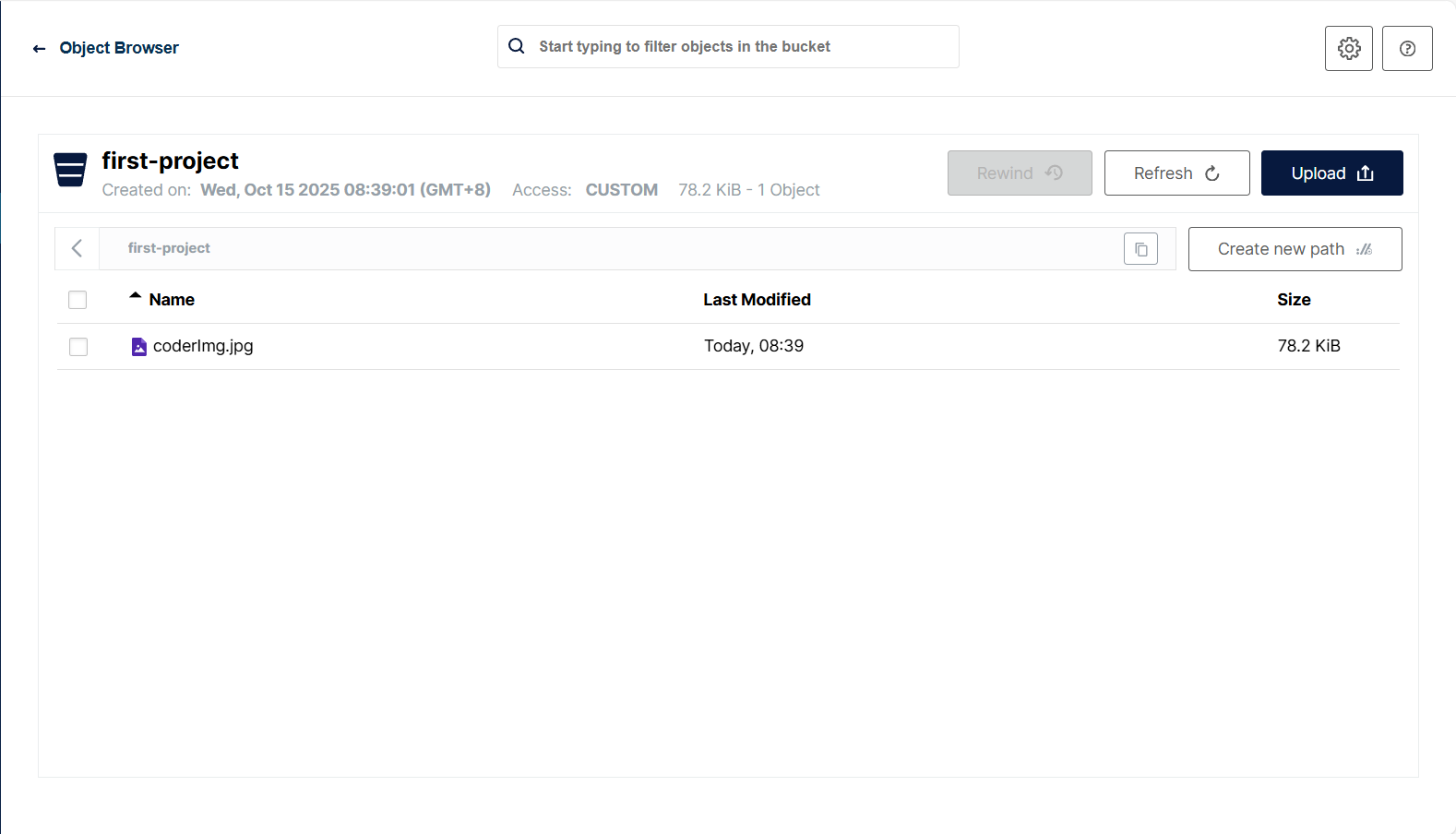 minioClient.uploadObject(UploadObjectArgs.builder().filename("C:\\Users\\93208\\Desktop\\Coder\\1.jpg").bucket(bucketName).object("coderImg.jpg").build());