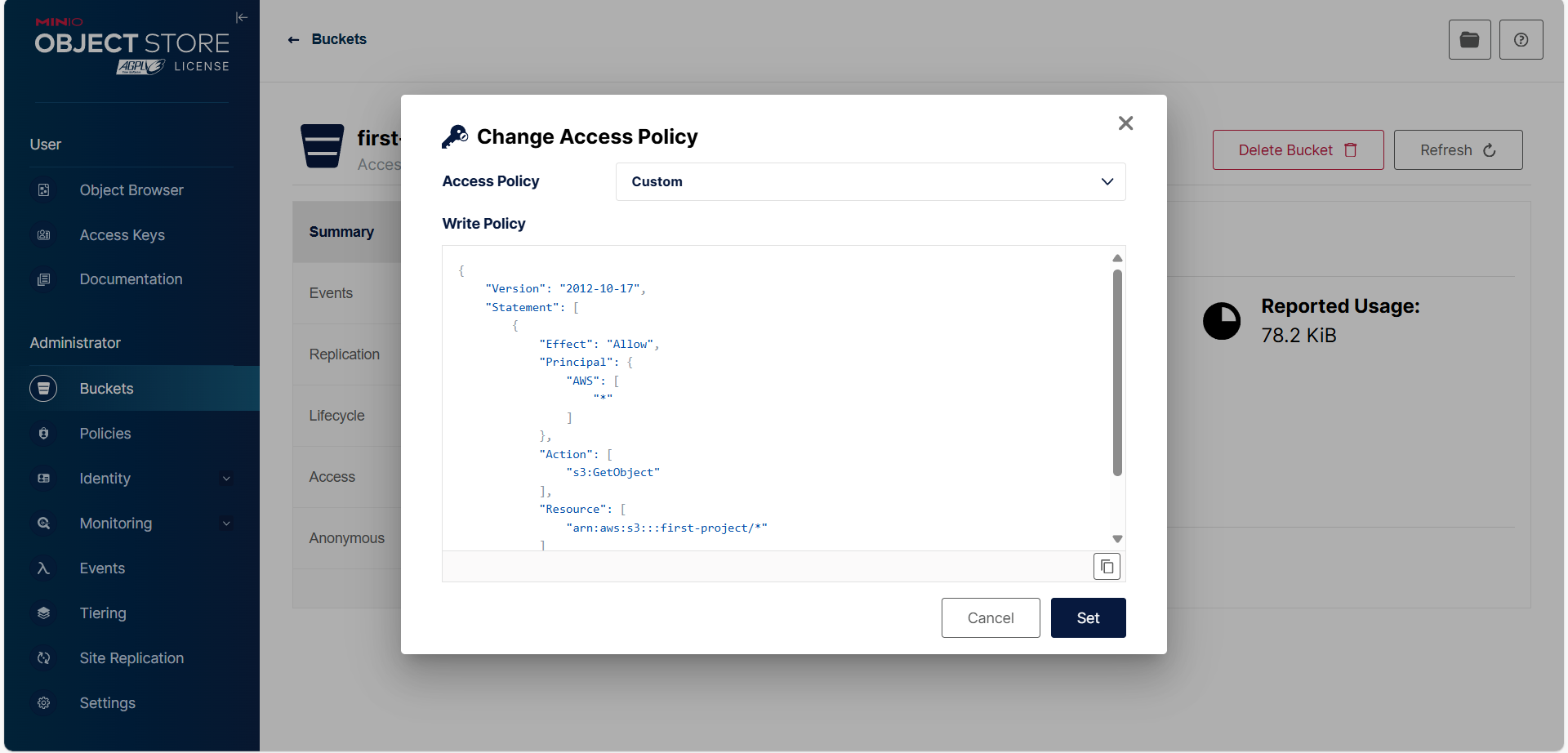 minioClient.setBucketPolicy(SetBucketPolicyArgs.builder().bucket(bucketName).config(policy).build());