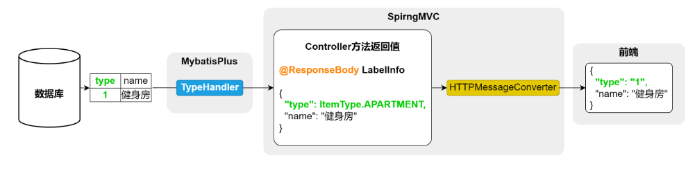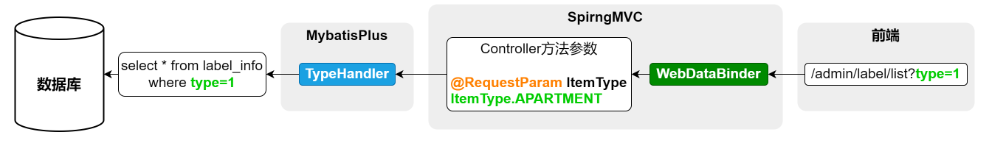 - 请求流程:前端传入type参数经过SpringMVC的WebDataBinder组件负责将HTTP的请求参数绑定到Controller方法的参数,并实现参数类型的转换 ,此时参数经历第一次类型转换;接着经过MybatisPlus的TypeHandler,用于处理Java中的实体对象与数据库之间的数据类型转换 ,此时经过第二次类型转换。