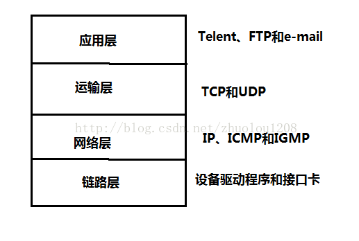 (3)运输层,包含协议TCP(传输控制协议)和UDP(用户数据报协议)。TCP把数据分成小块,交给网络层。UDP则为应用层提供服务,把数据报的分组从一台主机发送到另一台主机,但并不保证发送到另一台主机。