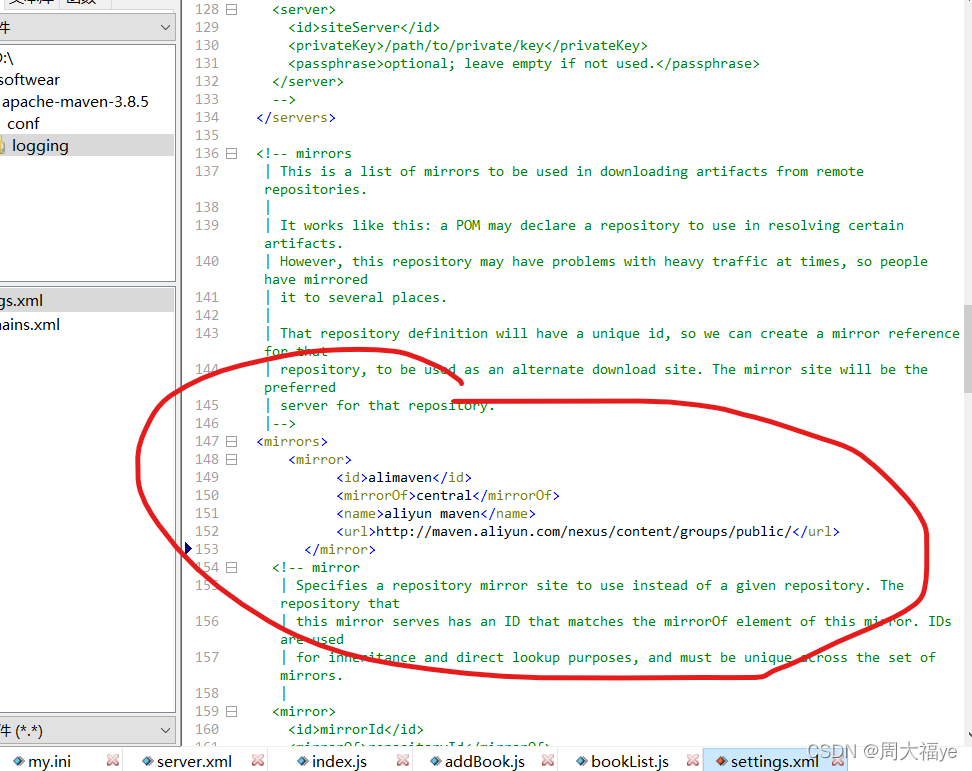 setting.xml中找到mirrors标签,再添加阿里镜像即可