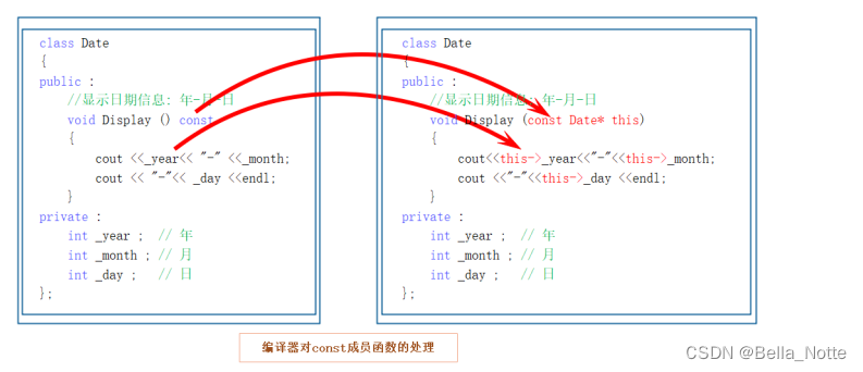 将const修饰的“成员函数”称之为const成员函数,const修饰类成员函数,实际修饰该成员函数 隐含的this指针,表明在该成员函数中不能对类的任何成员进行修改。