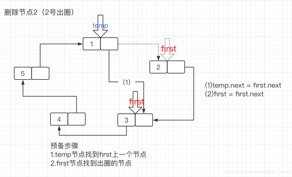 Boy temp = first;// 用来记录first上一个节点,方便删除(出圈)