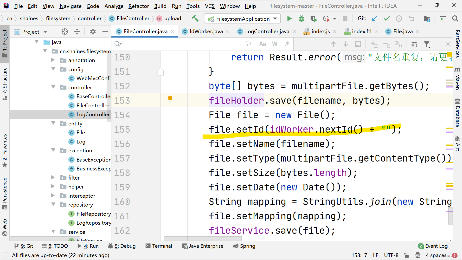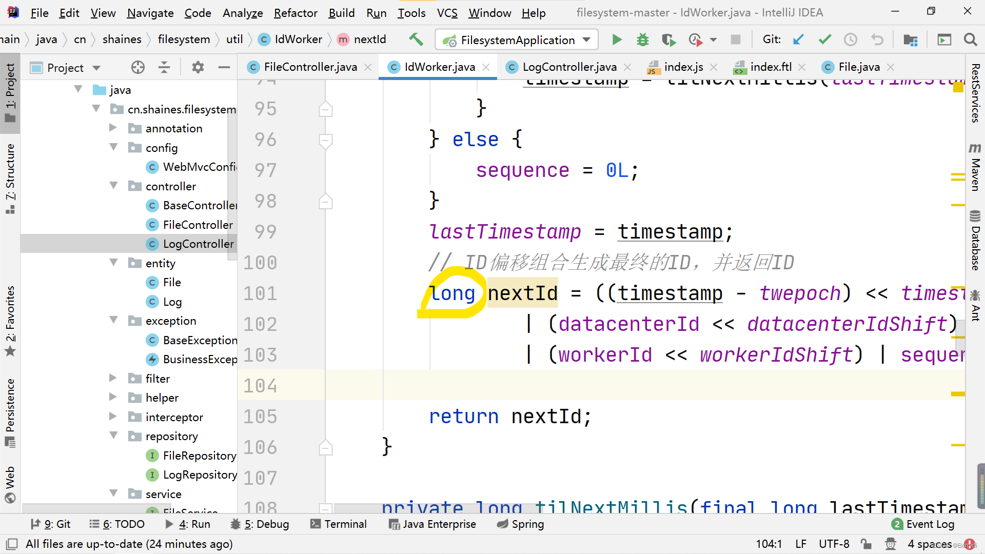 ② 在找idWoker,发现idWorker.nextId的类型是long,而file表中的id类型是int,因此无法装配