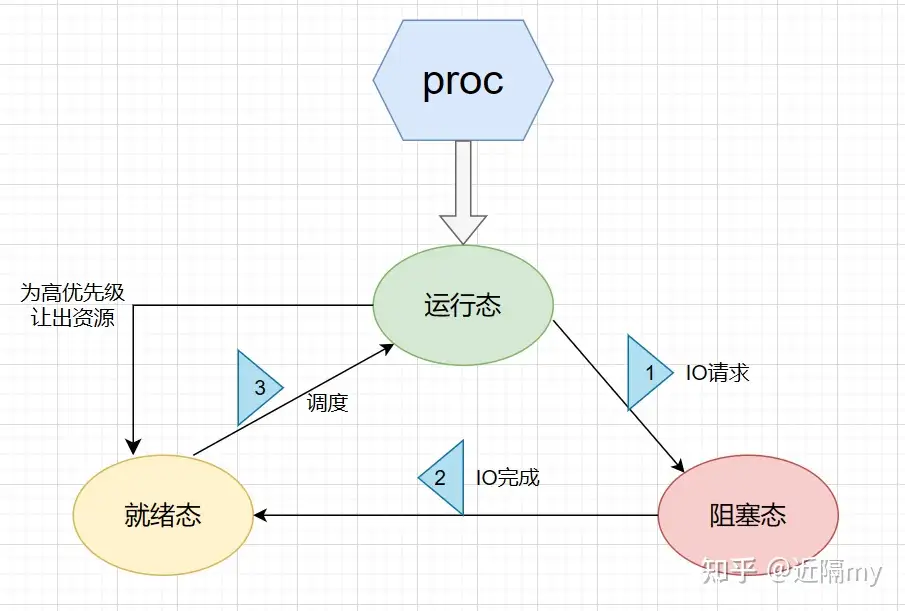 运行---->阻塞:进程IO操作,需等待而无法运行