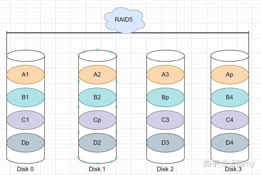 1.3.1原理:数据和奇偶校验信息分布存储在所有磁盘上,允许一块磁盘故障时重建数据。