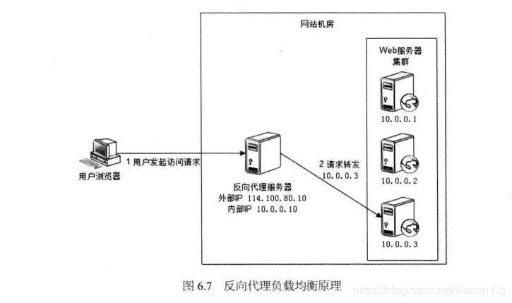 用户请求反向代理服务器,而反向代理服务器具备双网卡(内部+外部),通过负载均衡算法计算出请求转发的IP地址,进行请求转发,当业务处理结束后物理应用服务器返回给反向代理服务器,再由反向代理服务器返回给用户浏览器。