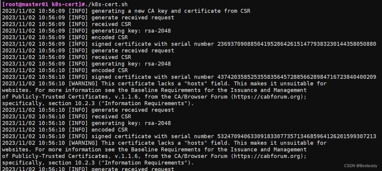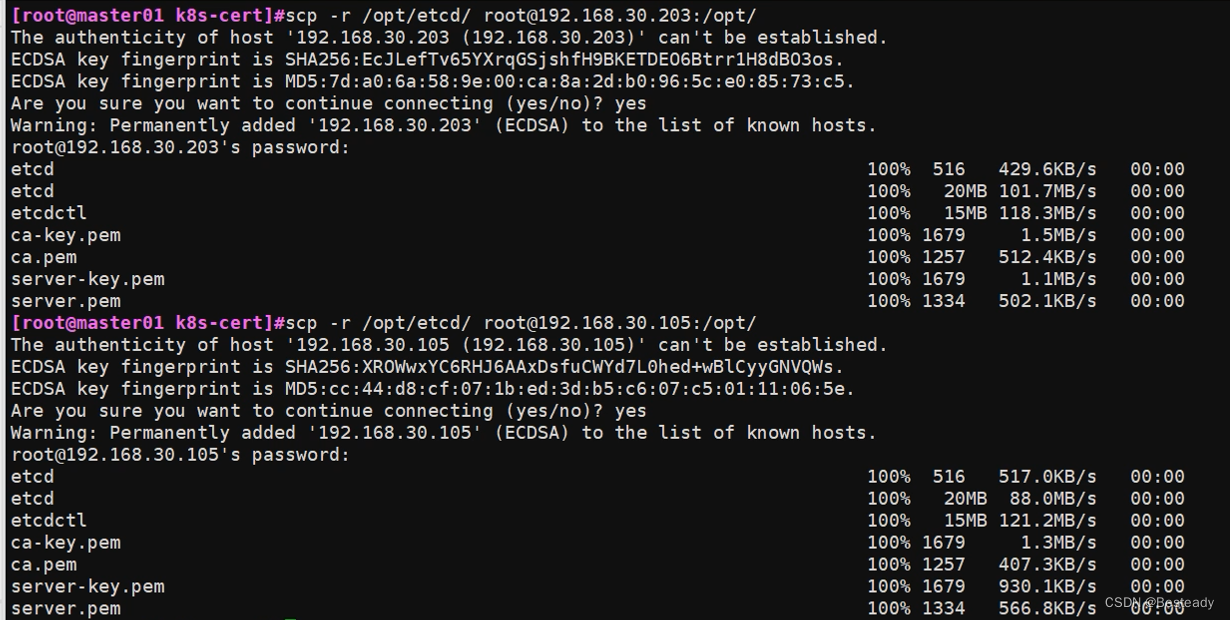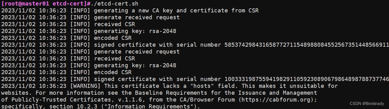 正常情况etcd应该生成三套证书:客户端证书,服务端证书,对等体证书(内部)。初学者可以先只生成两套。