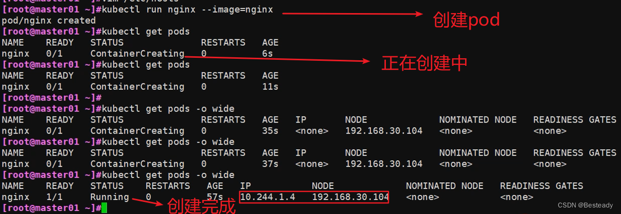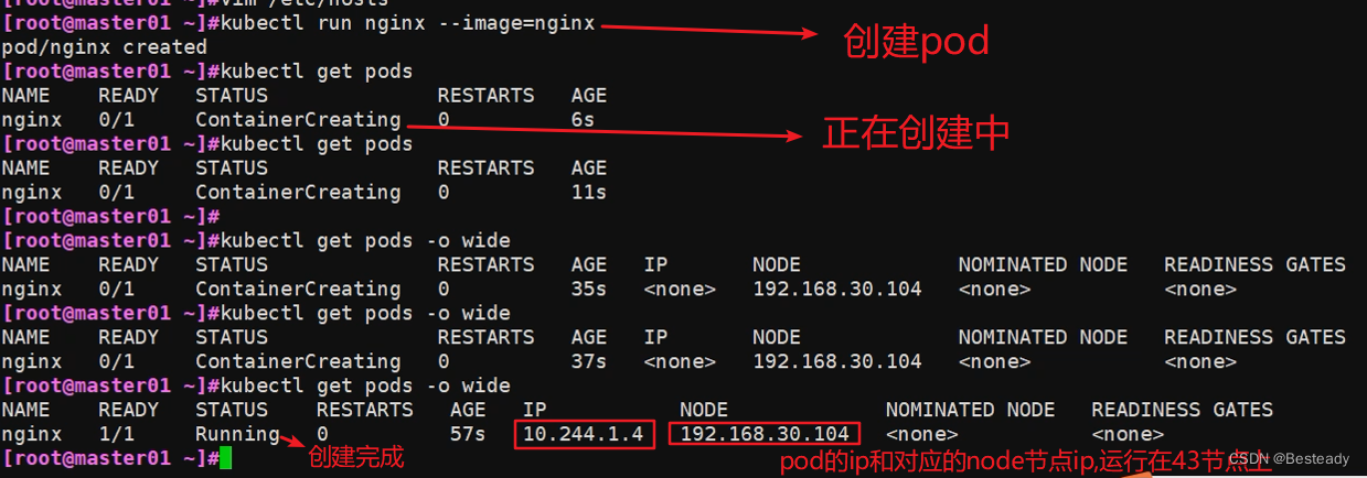 5)再通过apiserver找到对应的node节点上的kubelet去创建和管理Pod