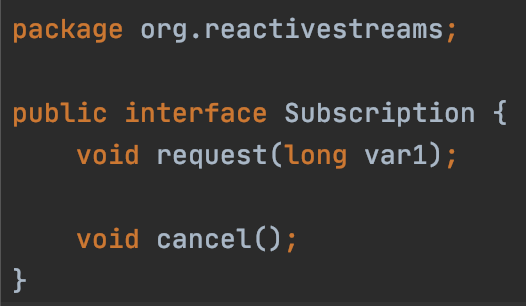 Subscription 代表的就是一种订阅上下文对象,它在订阅者和发布者之间进行传输,从而在两者之间形成一种契约关系,接口如下: