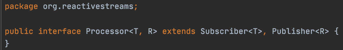 Processor 代表的就是订阅者和发布者的处理阶段,Processor 接口继承了 Publisher 和 Subscriber 接口。它用于转换发布者——订阅者管道中的元素。Processor 订阅类型 T 的数据元素,接收并转换为类型 R 的数据,并发布变换后的数据。可以拥有多个处理者。