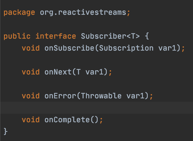 可以看到,Publisher 里的 subscribe 方法传入的是 Subscriber 接口,这里用的是回调,Publisher 根据收到的请求向当前订阅者 Subscriber 发送元素。