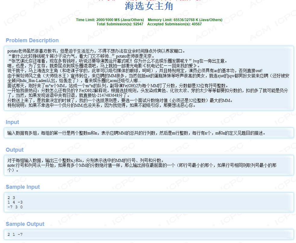 printf("%d %d %d\n", cmax_i, cmax_j, cmax);