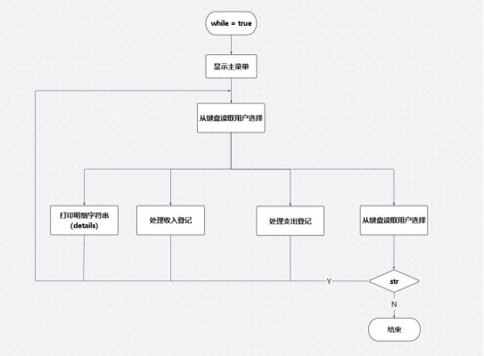 方法:使用while循环构建循环体,并且在其中提供分支结构,通过Scanner方法读取用户的选择,并为收入支出两种情况的变动进行录入,并使用数组将相关信息进行存储,同时在选择结构内通过输出方法,可以满足对已存储的数组内容输出,并且在该循环体内使用exit()方法来退出循环体结构,结束程序。
