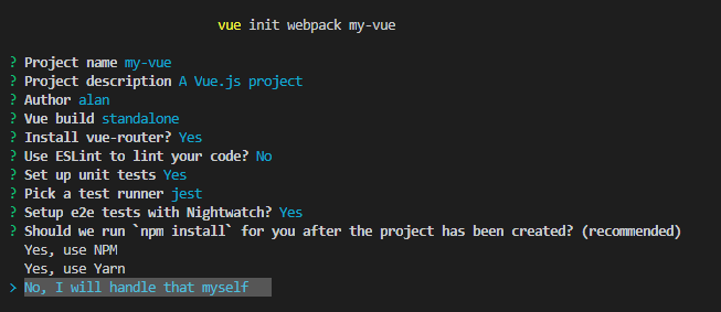 ?Setup e2e tests with Nighwatch?(Y/n)敲n回车