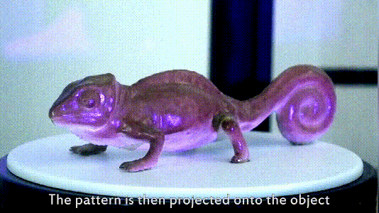 CSAIL团队成功模仿了变色龙的能力,他们开发出一种可编程墨水系统,让物体可以在紫外线(UV)和可见光的照射下改变颜色。