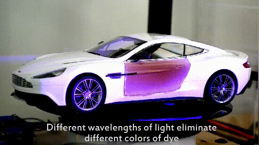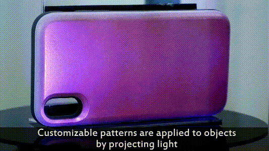 用这样的染料喷涂物体表面后,用户只需将物体放在装有投影仪和紫外光灯的装置中即可。紫外光控制各颜色的透明度,而投影仪则根据需要调节色彩饱和度,光线激活不同的颜色形成新的图案。如果对生成的图案不满意,只需使用紫外光将其擦除,然后就可以重新开始。