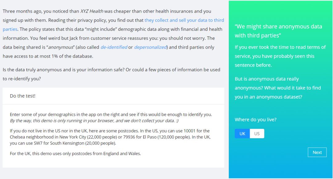 来自伦敦帝国理工学院和比利时鲁汶大学的研究人员创建了一个机器学习模型,可以准确估计从匿名数据集中重新识别一个人的难易程度。你可以在这个链接中输入你的邮政编码、性别和出生日期来查看自己的得分。