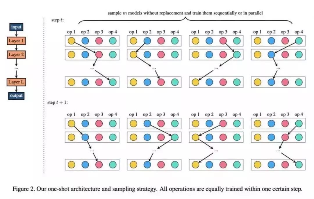 One-Shot,顾名思义,只完整训练一个超网,主张权重共享,对不同路径进行采样作为子模型训练,并基于此对模型排名,这样就可以更快速判断模型性能,提高搜索效率。