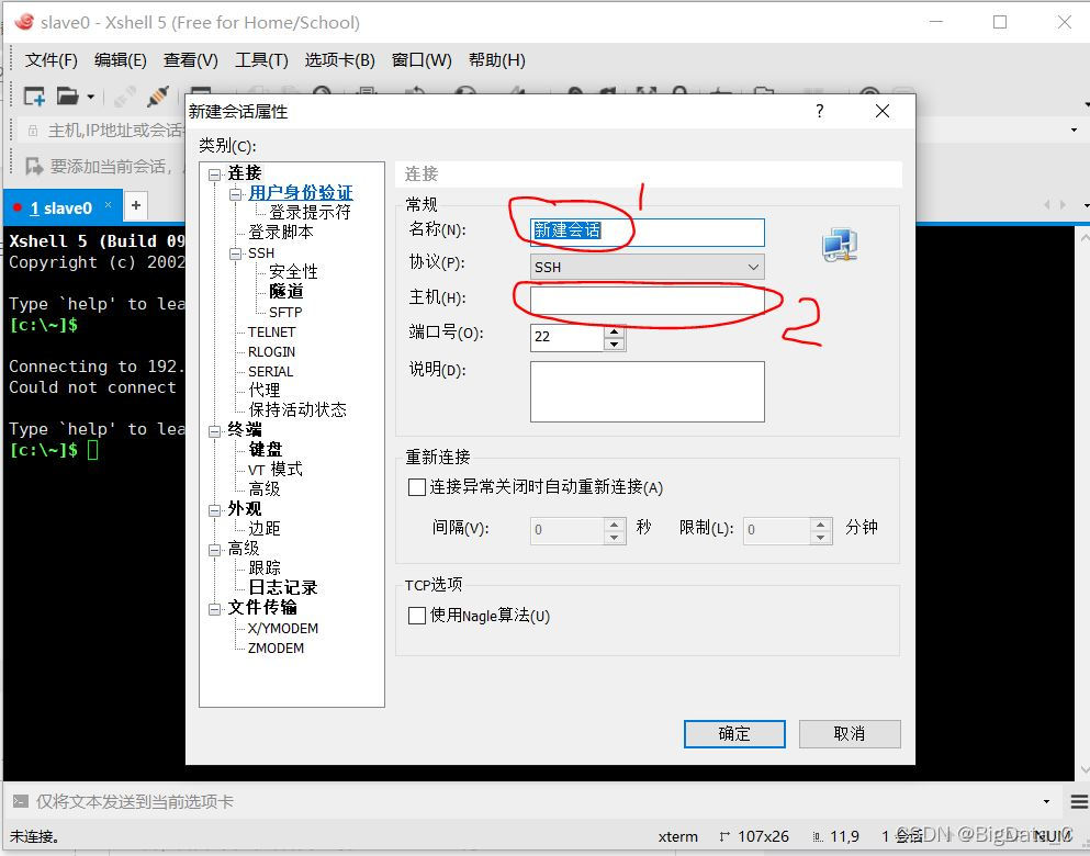 5.确认网段ip双方配置无误后,可用Xshell软件进行连接(没有的可以去百度搜索)