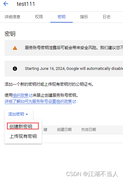 密钥格式为json,创建好后会自动下载到本地,需要保存好。