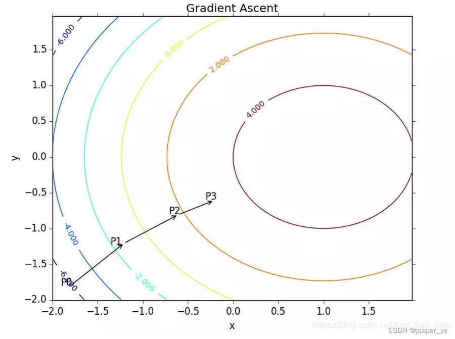 梯度上升算法到达每个点后都会重新估计移动方向。从P0开始,计算完该点的梯度,函数就根据梯度移动到P2。如此循环知道满足停止条件。