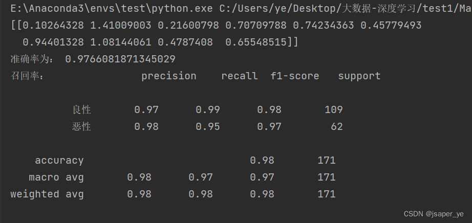 print("召回率:", classification_report(y_test, y_predict, labels=[2, 4], target_names=["良性", "恶性"]))