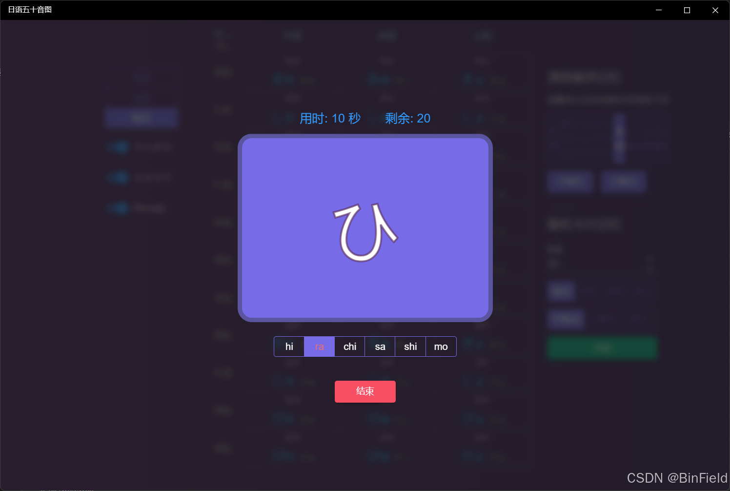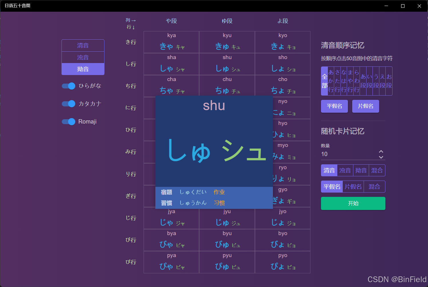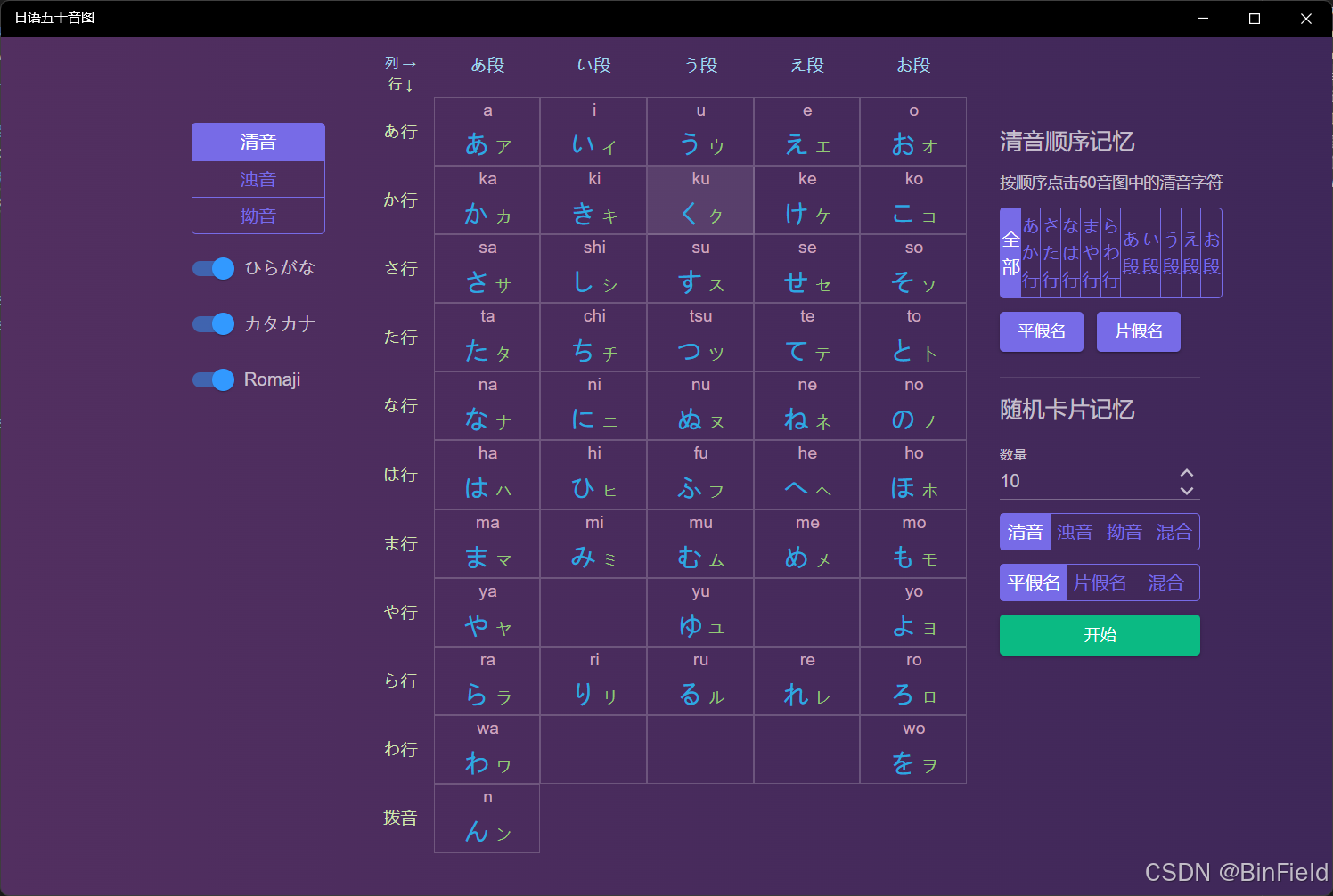 字母学习:在左侧可以选择显示清音、浊音或拗音,下方三个开关可以设置中间部分显示内容,分别用于控制平假名、片假名和罗马字是否显示。