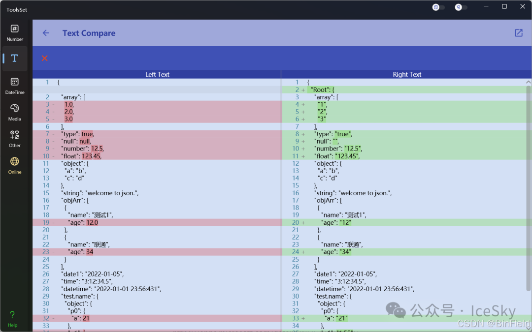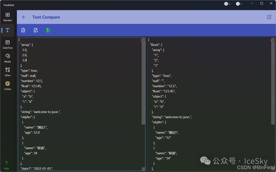 ToolsSet中Text菜单下的Text Compare是一个文本比较工具,可以输入或打开两个文本文件进行比较。