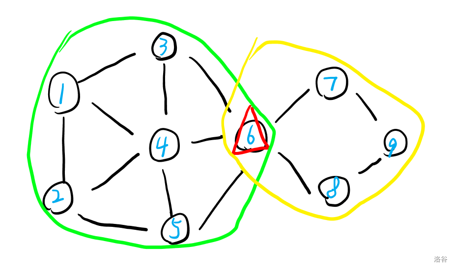 在上图中,标有红色三角形的点 666 就是一个割点,所以它将图分成了两个点双连通分量:分别是绿色区域和黄色区域。