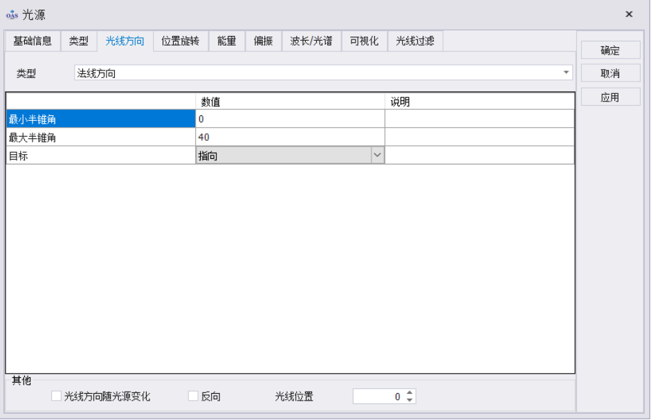 我们需要在 LED 模型中创建一个光源来模拟发光芯片,这里我们选择的是平面朗伯光源,并设定了光源出射角度,OAS 也可以导入文件光源。OAS 中包含多种光谱,例如黑体光谱、高斯光谱、太阳光谱等,也支持导入光谱数据。