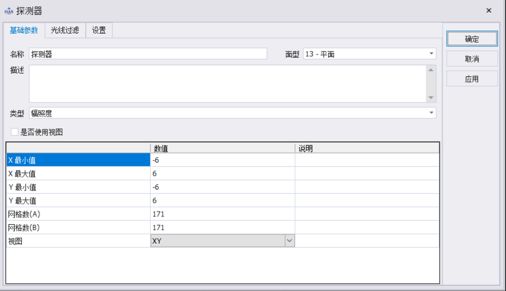 建立一个 X/Y 半孔径均为6的矩形平面,坐标位置为(0,0,10),创建完成后,创建探测器并赋在该平面上,探测器分辨率为171X171,如下图所示: