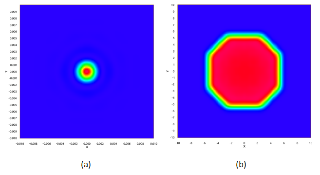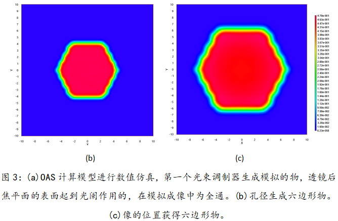 阿贝成像过程通过图3(a)OAS计算模型进行数值仿真,模型中平行光入射,产生六边形物,如图(b)所示,成像过程通过传输和透镜实现,在计算模型中的第二个传输的传输距离设计为从透镜到后焦平面长度,第三个传输的传输距离与第二个传输距离相加正好为像距,在像的位置获得六边形物,如图(c)所示。通过光衍射传输模拟显示了阿贝成像过程。