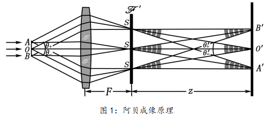 从光的夫琅禾费衍射的频谱变换观点,相干成像过程分为两步完成。第一步是平面波照射物体,发生夫琅禾费衍射,在透镜后焦平面上衍射场形成与物体平面波集合一一对应的衍射斑;第二步是衍射斑看成是一个个点源,这些点源发出次级波,在像平面上相干叠加,形成的干涉图样就是物体所成的像。这种相干成像过程的两步分析观点,称为阿贝成像原理。