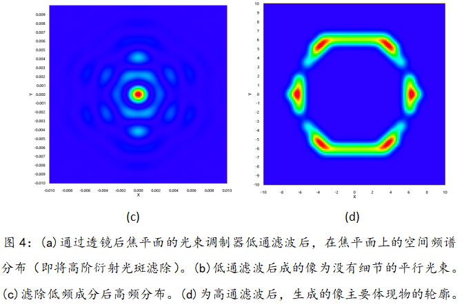 为了充分体现阿贝成像过程的物理意义,当在计算模型中的第二个传输处放置可以起到光澜作用的光束调制器,通过低通滤波和高通滤波,阿贝成像的分频与相干叠加过程,计算模型同图3(a)。图4(a)是低通滤波后,在焦平面上的空间频谱分布(即将高阶衍射光斑滤除),产生的像为没有细节的平行光束,如图(b)。如果滤除低频成分,图(c)给出了通过的高频成分分布;图(d)高通滤波后的像,主要体现物的轮廓。