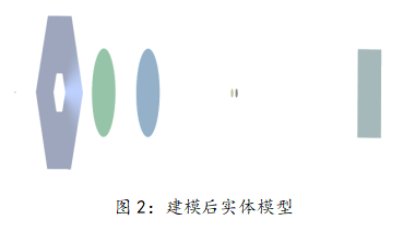 首先在OAS中创建一个束腰半径为7mm、采样方式为矩形的GBD场光源,再创建一个半孔径为20mm、孔径比例为0.25的六边形平面,半孔径为10mm的光源平面,半孔径为10mm、焦距为20mm的理想透镜,半孔径为1mm、孔径比例为0.2的低通面,半孔径为0.2mm的高通面,半孔径为1mm的频谱平面,半孔径为10mm的矩形探测平面,建立完成后实体模型如下图: