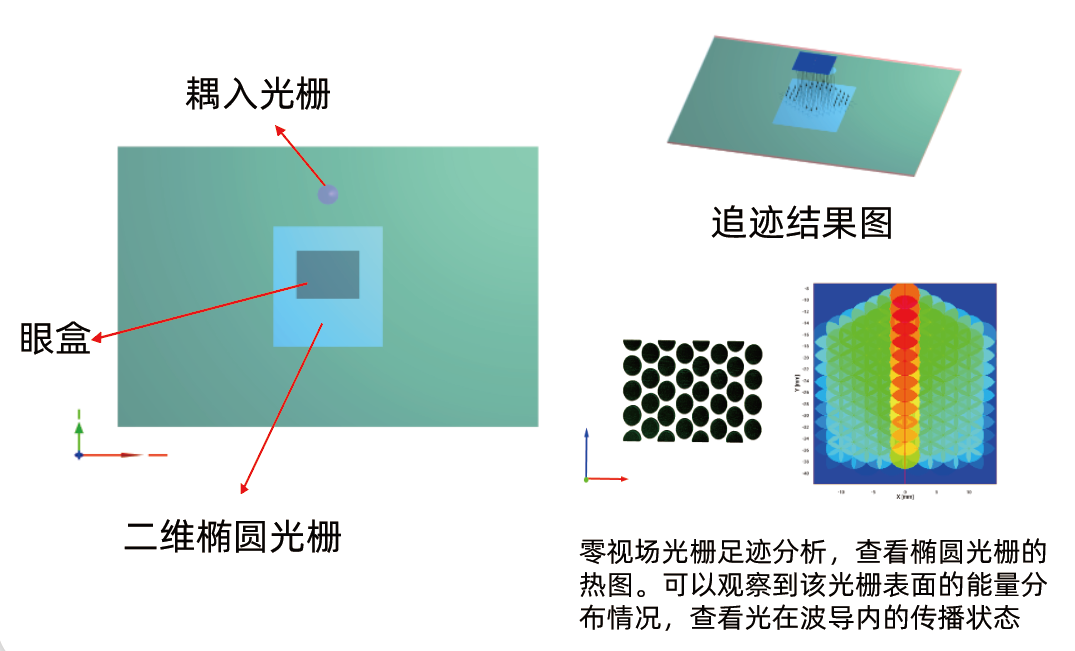 在现代光学系统中,二维光栅因其独特的光学特性,在光的转向、扩束及耦出等方面发挥着关键作用。椭圆光栅作为二维光栅的重要类型,其非对称结构赋予了它更为复杂且多样化的光学功能。本案例基于 OAS 光学软件,旨在通过对二维椭圆光栅波导的模拟与分析,充分发挥其转向扩束和耦出的双重作用,并精确呈现光线追迹结果及光栅表面能量分布情况,为光学器件设计与优化提供科学依据与技术支撑。