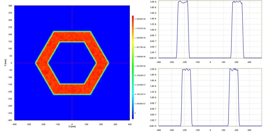 在本案例中,采用非序列追迹模式更能准确模拟光线在复杂光学系统中的传播行为,包括光线在镜片表面的反射、折射以及在不同介质中的传播损耗等。通过大量光线的追迹,获得光线在系统中的详细传播路径与能量分布数据。利用照度探测器等工具,分析目标投影区域上的照度分布情况,直观地了解光线均匀性状态。同时,还可以查看光线在与每个面进行交互时,丢失、被吸收的光线数和能量大小,为进一步优化光学系统提供依据。