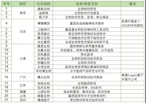 不完全统计,中国涉及基因编辑的企业有21家,大多数以技术支持和服务外包为主,客户来源医疗机构、企业、科研院所与高校等,可见基因编辑技术本身在国内发展较为成熟,接受度较高。