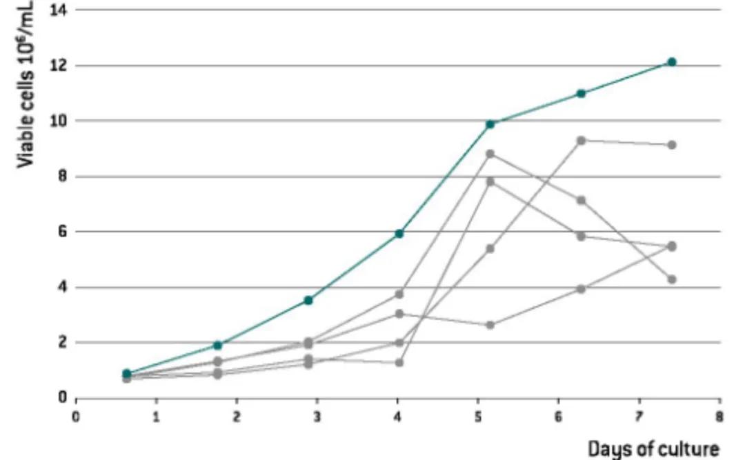 图2. Sf9细胞在TheraPEAKTM SfAAVTM培养基(绿色)中的生长速度比在检测的培养基(灰色)中更快,因此客户能够以最高的细胞密度(约3×106个细胞/mL)启动杆状病毒感染,至少可比检测的其它培养基提前1天。