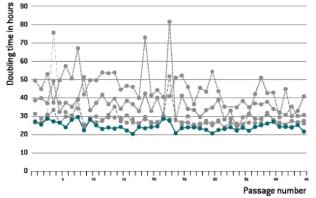 图1. Sf9细胞在TheraPEAK TM SfAAV TM培养基(绿色)中的45次传代倍增时间优于检测的其它培养基(灰色),确保Sf9细胞性能随时间的推移更一致,从而使客户能够对生产运营制定更准确的计划。