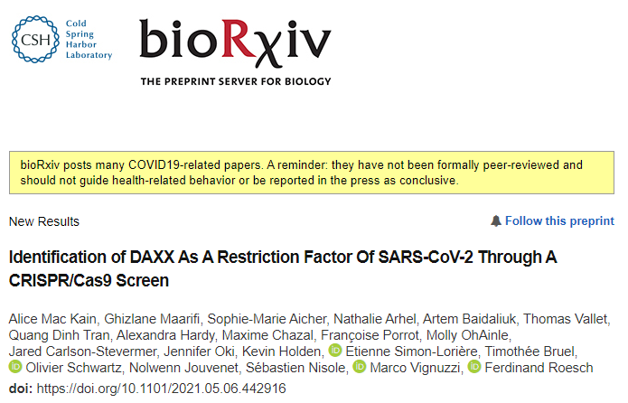 2. Mac Kain, A., Maarifi, G., Aicher, S. et al. 2021. Identification of DAXX As A Restriction Factor Of SARS-CoV-2 Through A CRISPR/Cas9 Screen. https://www.biorxiv.org/content/10.1101/2021.05.06.442916v1.full