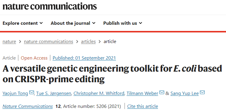 5. Tong, Y., Jørgensen, T.S., Whitford, C.M. et al. A versatile genetic engineering toolkit for E. coli based on CRISPR-prime editing. Nat Commun 12, 5206 (2021). https://doi.org/10.1038/s41467-021-25541-3