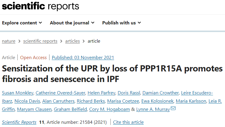 4. Monkley, S., Overed-Sayer, C., Parfrey, H. et al. Sensitization of the UPR by loss of PPP1R15A promotes fibrosis and senescence in IPF. Sci Rep 11, 21584 (2021). https://doi.org/10.1038/s41598-021-00769-7