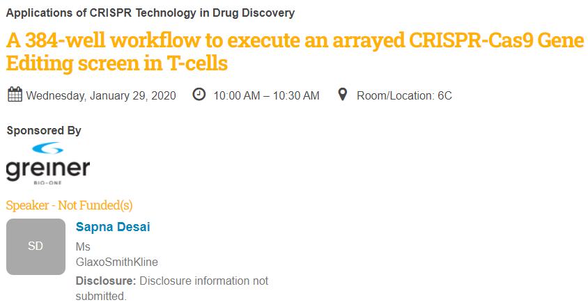 在SLAS2020国际会议与展览上,GSK分享了“在T细胞中进行阵列CRISPR-Cas9基因编辑筛选的384孔工作流程”的研发经验。